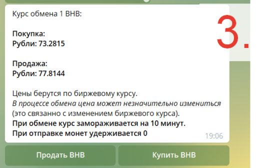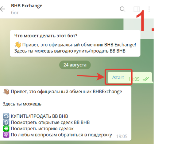 - Переходим в обменник по ссылке @bhbexchangebot и запускаем его (/start).