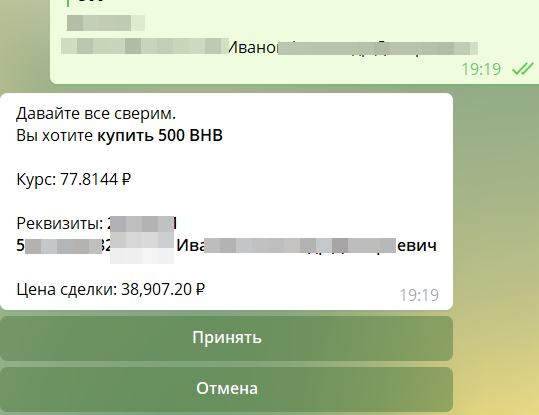 не так — Отмена.что-то - Переводите указанную сумму на карту, номер которой появится в сообщении и после этого обязательно жмете «Я перевел»