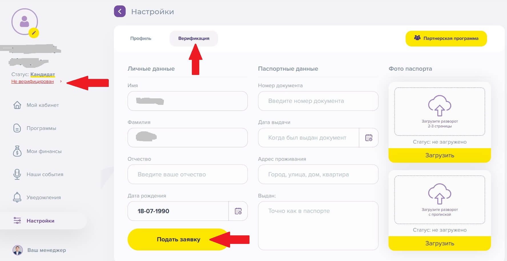 - Жмём Верификацию. Вводим данные паспорта, подгружаем сканы паспорта, нажимаем Подать заявку.