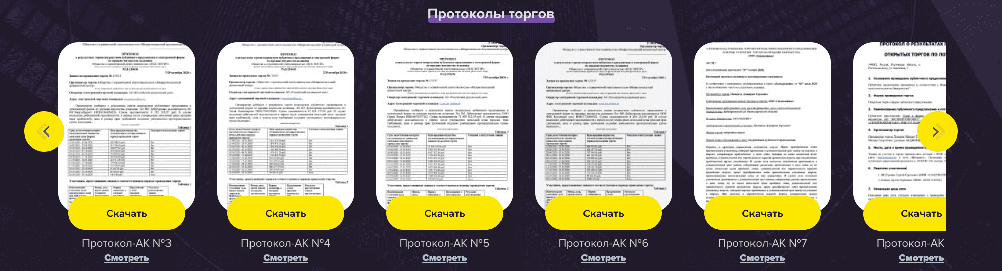 Также в самом низу сайта symbios finance есть раздел «документы компании», перейдя по которому, вы можете увидеть протоколы торгов на общую сумму более 3 млрд. рублей! Нажав на кнопку «смотреть» вас перекинет на независимый сайт торговой площадки, где вы можете убедиться в том, что данный лот действительно был выкуплен сотрудниками Symbios Club.