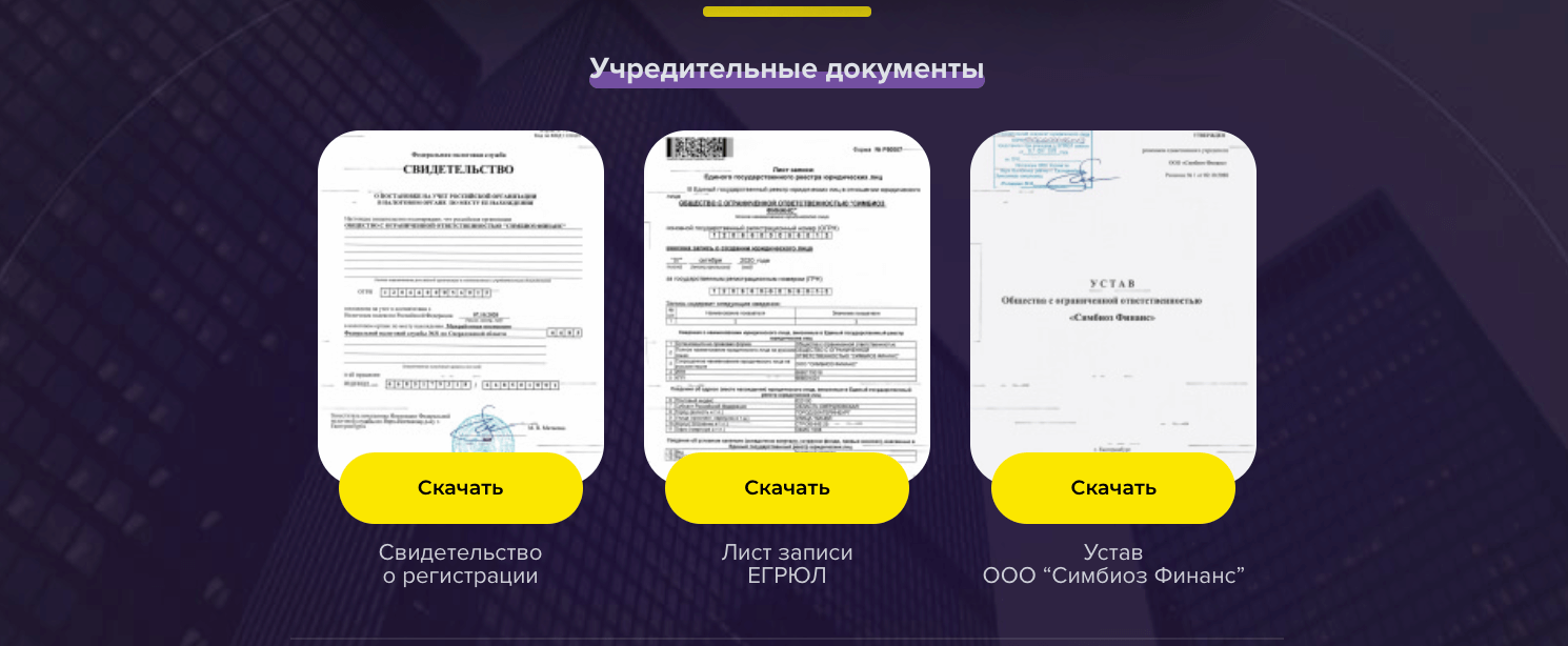 А чуть выше есть и документы о регистрации компании Symbios finance, которая зарегистрирована в России и официально платит налоги. Головная компания — ООО «Симбиоз Финанс» (ИНН 6685179318)