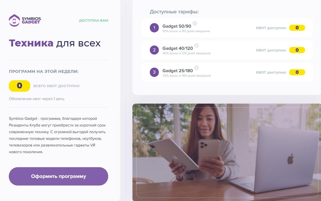 Cпецифика проекта состоит в том, что вы не можете инвестировать, если вы не являетесь членом закрытого клуба Symbios Finance. Стоимость членства составляет 12 000 руб. на год. После оплаты клуба вы можете выбрать инвестиционный пакет, и только потом ловить квоту на покупку имущества или других услуг, т.к. квоту можно получить только с действующим депозитом, который должен составлять не менее 20% от итоговой выплаты по квоте!